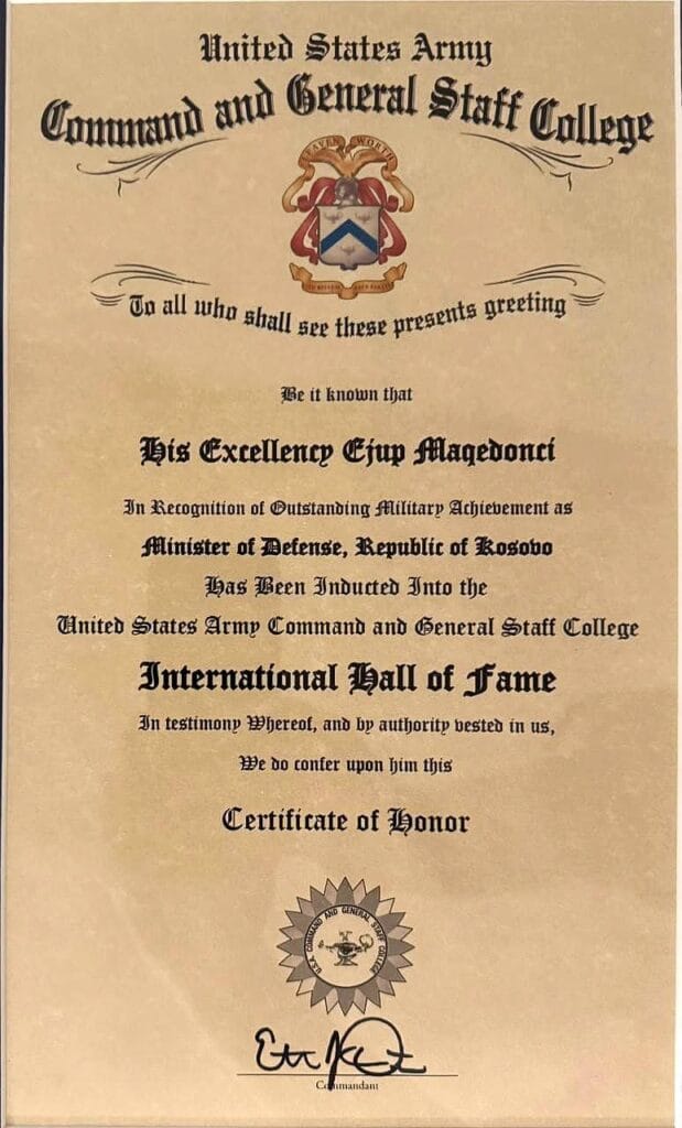 Kosova Savunma Bakanı Ejup Maqedonci, Amerika Birleşik Devletleri Kara Kuvvetleri Komuta ve Genelkurmay Koleji’nin (U.S. Army Command and General Staff College) Şeref Salonu’na (Hall of Fame) kabul edilmekten büyük onur duyduğunu açıkladı.