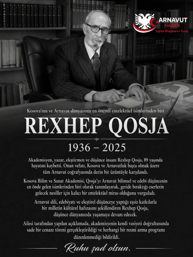 Kosova’nın ve Arnavut dünyasının en önemli entelektüel isimlerinden biri olan Akademisyen Rexhep Qosja, 89 yaşında hayatını kaybetti. Onun vefatı, Kosova ve Arnavutluk başta olmak üzere tüm Arnavut coğrafyasında derin bir üzüntüyle karşılandı.