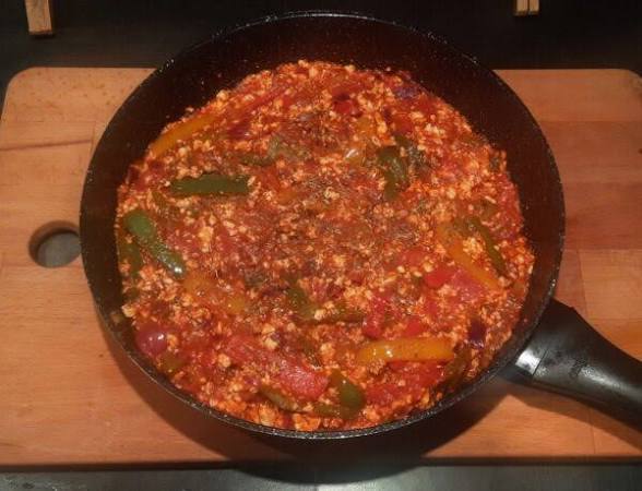 Speca të Mbushura yani dolma biber. Pirinç, kıyma ve baharatlarla doldurulan biberler domates sosuyla pişirilir.