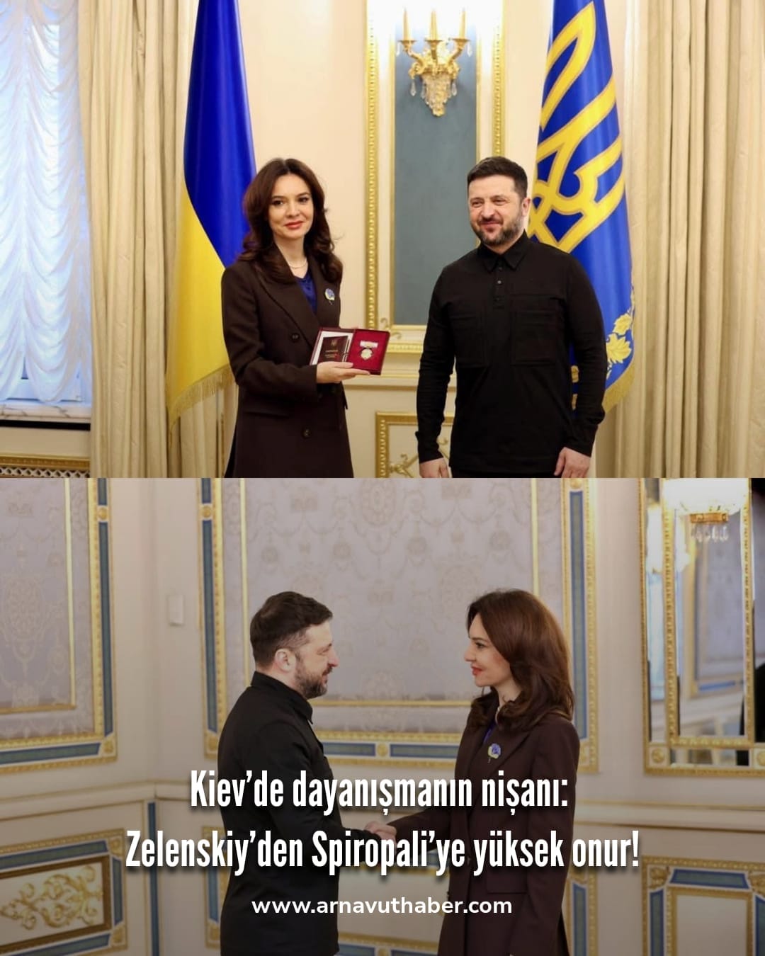 Ukrayna Cumhurbaşkanı Volodimir Zelenskiy, Kiev’de düzenlenen törende Arnavutluk Avrupa ve Dışişleri Bakanı Elisa Spiropali’ye, Ukrayna’nın en yüksek devlet nişanlarından biri olan Prenses Olga Nişanı (I. Sınıf)nı takdim etti.