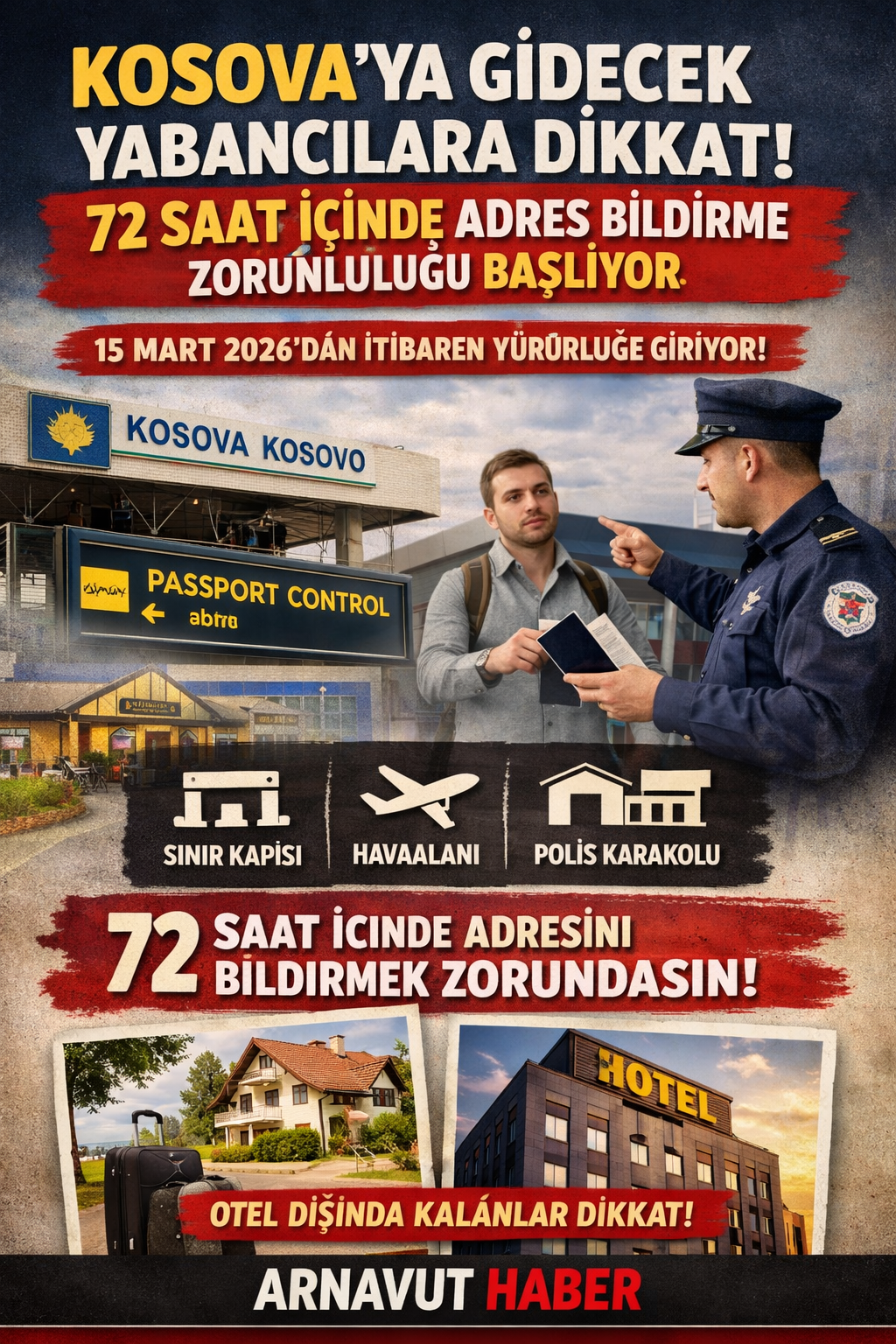 Kosova’da yabancı ülke vatandaşlarını ilgilendiren önemli bir uygulama 15 Mart 2026 tarihinden itibaren daha sıkı şekilde uygulanmaya başlanacak. Buna göre Kosova’ya giriş yapan yabancıların, ülkeye girdikten sonra en geç 72 saat içinde kalacakları adresi resmi makamlara bildirmeleri gerekecek.
