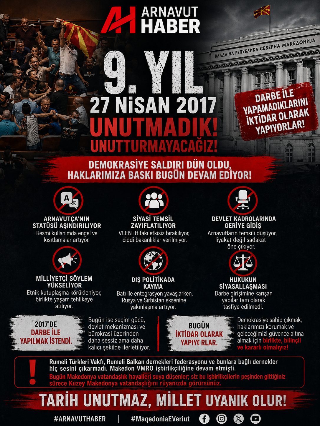 O gün nasıl ki demokratik değerlere sahip çıkan bilinçli Arnavutlar bu darbe girişimine karşı durduysa, bugün de aynı bilinçle hakların geriletilmesine karşı durmak zorundadır.