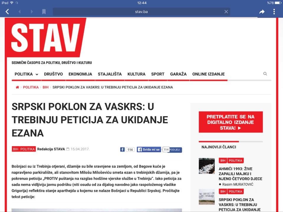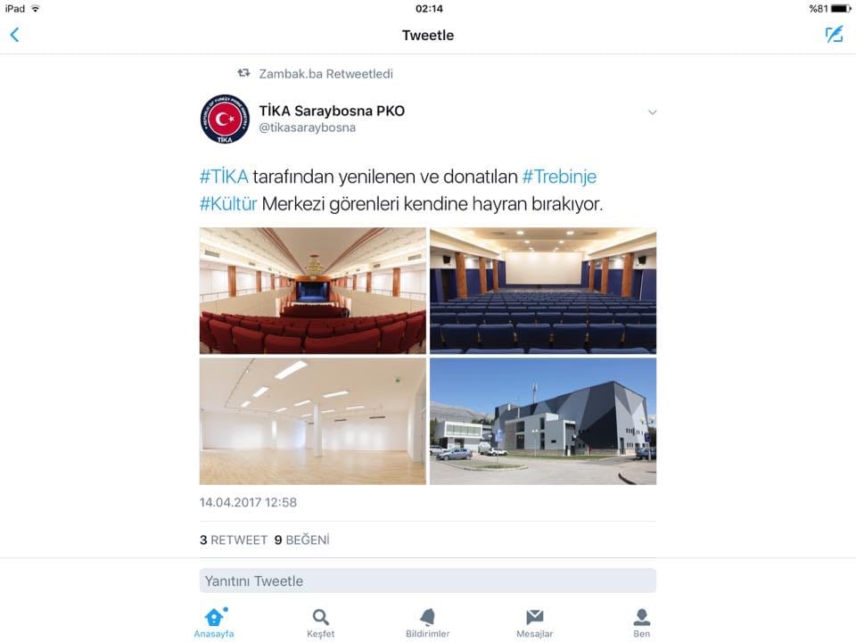 Geçtiğimiz aylarda Tika Bosna’nın Sırp bölgesinde Trebinje şehrinde sırplara kültür merkezi inşaa etmiş. Merkezin açılış günü Trebinye Sırpları ezanın yasaklanması için imza kampanyası başlatmıştı. Alttaki resimlerde tikanın yaptığı kültür merkezi ve sırpların verdiği tepki yeralıyor.