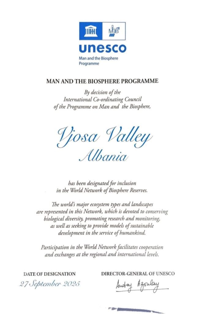 Bu prestijli unvan, bölgenin dünya çapındaki en önemli ekosistem tiplerini ve manzaralarını temsil ettiğini gösteriyor. Biyosfer Rezervleri Ağı, özellikle biyolojik çeşitliliğin korunmasına, araştırma ve izleme faaliyetlerinin teşvik edilmesine ve insanlığın hizmetinde sürdürülebilir kalkınma modellerinin sağlanmasına odaklanıyor.Tarihi KararSertifikada belirtildiği üzere, Vjosa Vadisi’nin bu ağa dahil edilme tarihi 27 Eylül 2025 olarak kaydedildi. Karar, UNESCO Genel Direktörü Audrey Azoulay’ın imzasıyla tescillendi.